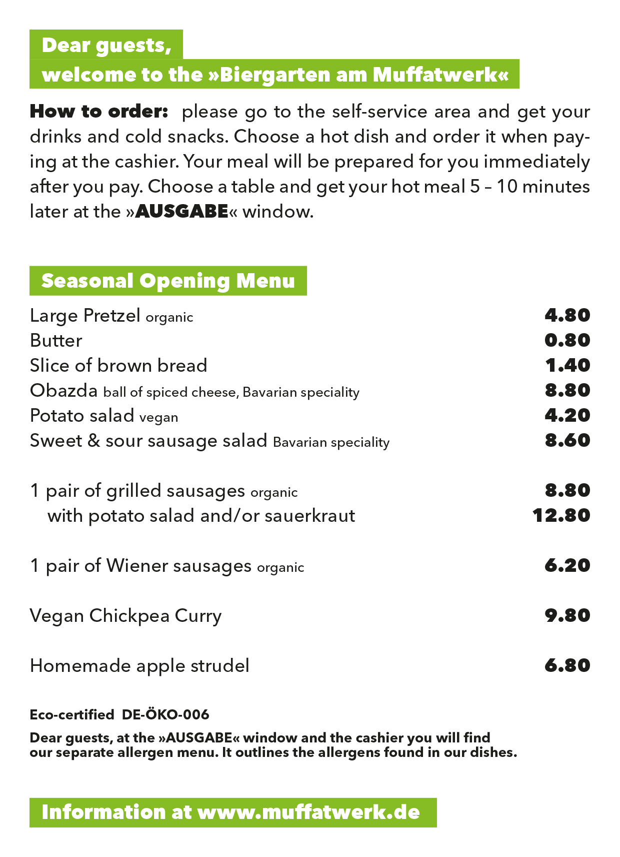 Please note: Drinks and snacks (Brotzeit) are available in the self-service area. Hot dishes can be ordered when paying at the register. These are freshly prepared for you and can be picked up 5–10 minutes later at the counter.